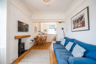 This stunning two-bedroom Lower Largo double-upper apartment presents a rare opportunity to acquire an immaculate coastal home or investment with a breathtaking coastal outlook. From its captivating, whitewashed façade accented with nautical blue finishes, you enter a ground-floor hallway where carpeted stairs usher you to the first floor. Here you find a bright and spacious dual-aspect living room kitchen. Boasting a crisp neutral décor and a focal log-burning stove nestled beneath an oak mantle the living room exudes a sense of warmth and cosiness. The U-shaped kitchen offers a thoughtful divide from the living room with white wall and floor units complemented by smooth white worktops and integrated appliances including a striking pale blue electric fan-assisted AGA with a ceramic hob. Leaving here you come to the highlight of the property, a spectacular south-facing sunroom with full-height windows offering uninterrupted views across the beach to the Firth of Forth. With custom-made seating, it is an enviable retreat for moments of relaxation and entertaining whilst surrounded by natural beauty. This floor is completed by a well-appointed bathroom where soothing green metro-tiling provides the backdrop to a chrome towel radiator, WC, a countertop washbasin, and a bath with a wall-mounted shower. Ascending to the second floor, two light and airy double bedrooms provide a tranquil escape with the south-facing principal enjoying breathtaking views, a feature fireplace and built-in storage. Each shares access to a stylish shower room equipped with a WC, chrome towel radiator, and washbasin built into vanity.